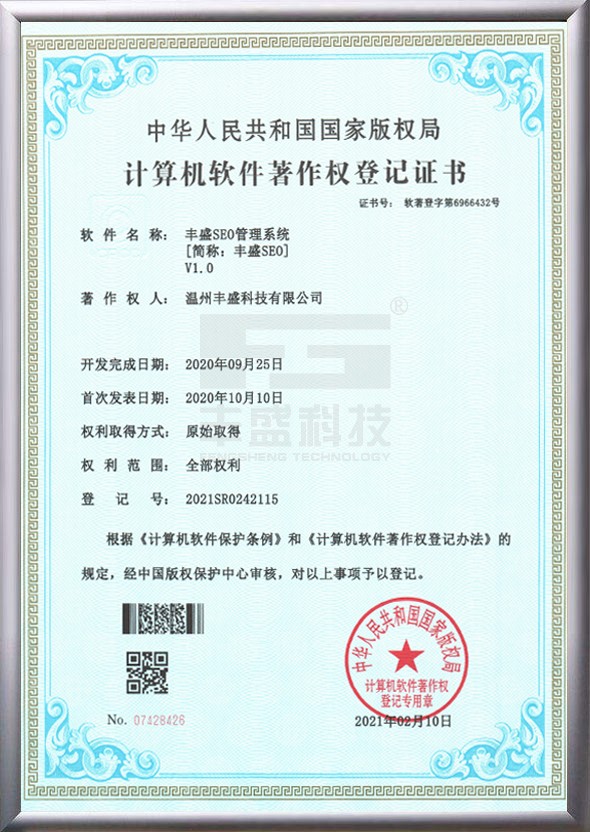 2、“豐盛SEO管理系統(tǒng)V1.0”(簡稱:豐盛SEO)的法定著作權(quán)人,并于2021年02月10日被正式授予《中華人民共和國**版權(quán)局計算機軟件著作權(quán)登記證書》,登記號為2021SR0242115。
