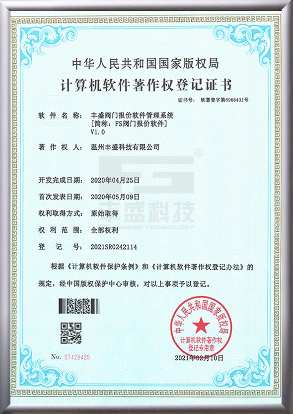 1、“豐盛閥門報價軟件管理系統(tǒng)V1.0”(簡稱:FS閥門報價軟件)的法定著作權(quán)人,并于2021年02月10日被正式授予《中華人民共和國**版權(quán)局計算機軟件著作權(quán)登記證書》,登記號為2021SR0242114。